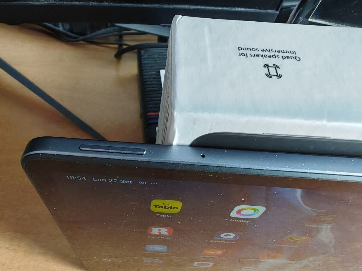 La cornice superiore ospita il bilanciere del volume e il carrellino per due schede nano SIM e una micro SD. Sul frame sinistro c’è il tasto di accensione e due speaker, mentre a destra altoparlanti, il jack da 3,5 mm e la porta USB C.