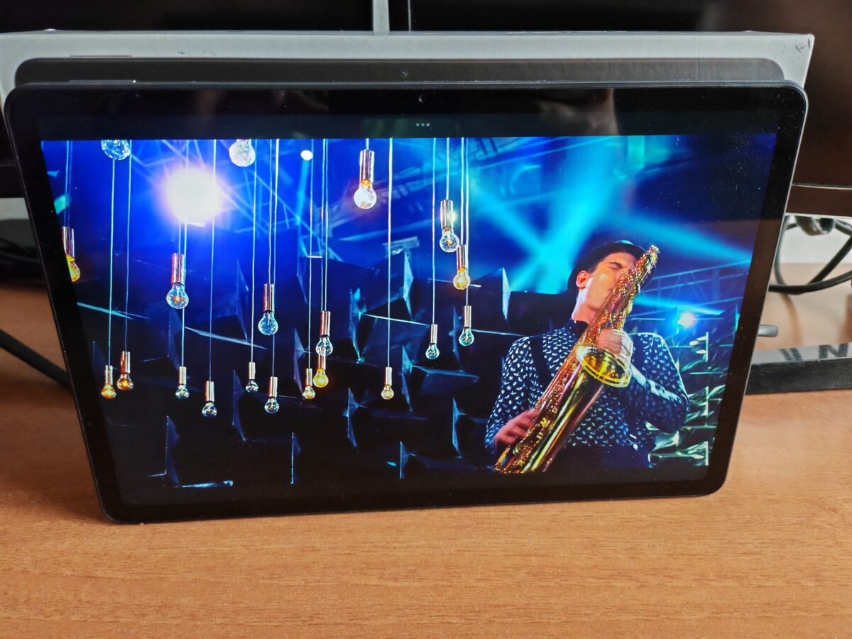 Appena si prende in mano il tablet colpisce subito l’ampio display LCD da 11 pollici senza interruzioni. Infatti la fotocamera anteriore da 5 megapixel è situata nella cornice superiore. Questa supporta lo sblocco facciale, in due dimensioni, che è veloce e preciso con molta luce. Non manca il sensore di luminosità che funziona molto bene